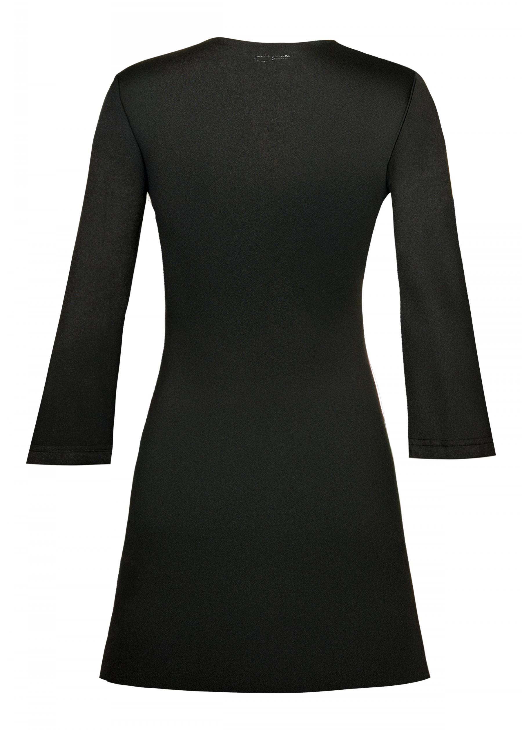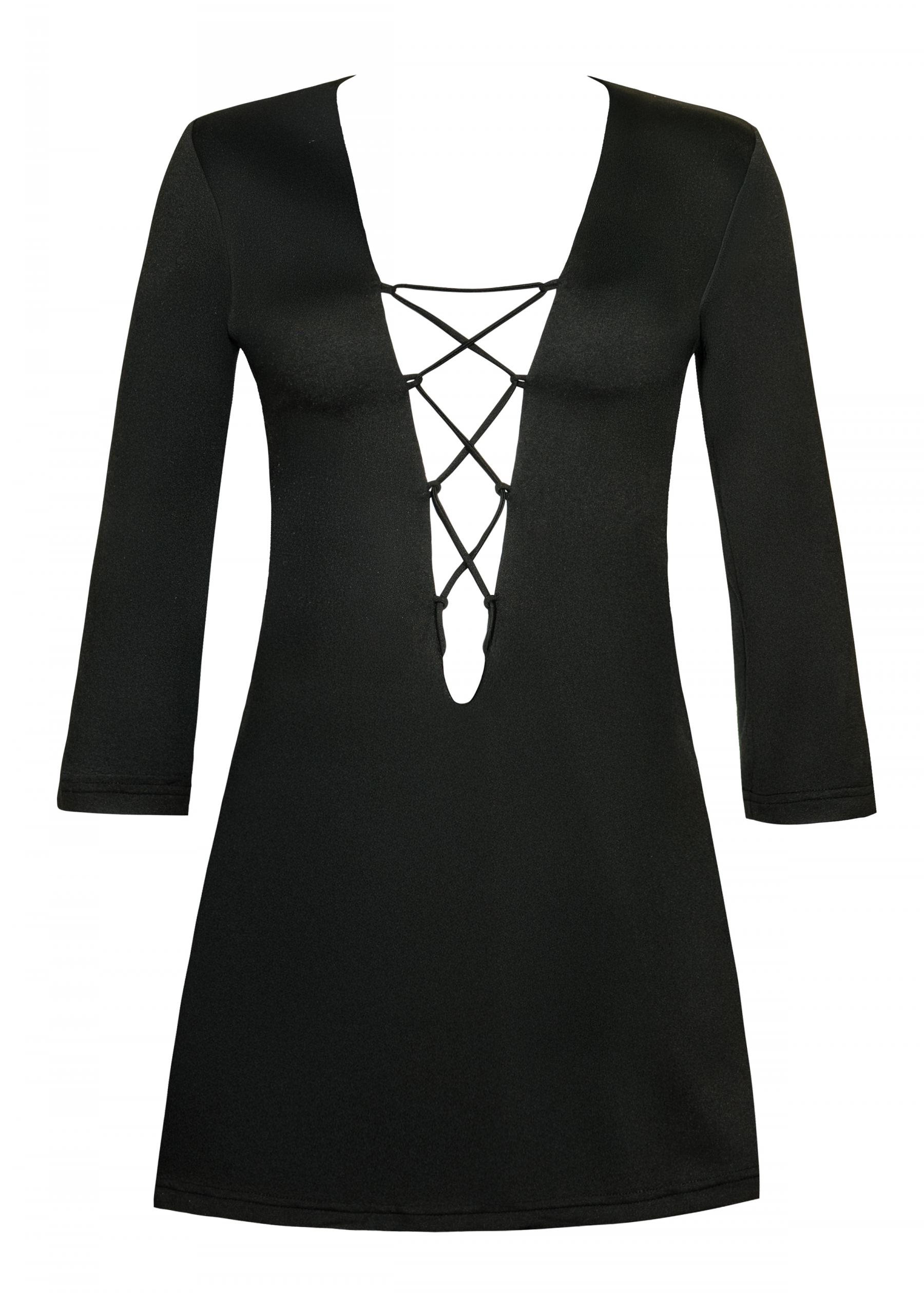 Mini abito femminile dal design elegante e contemporaneo, con maniche a 3/4 a campana che donano movimento e leggerezza alla silhouette. La vestibilità a trapezio valorizza la figura con una linea fluida e confortevole. Il modello è profondamente scollato, arricchito da lacci regolabili che permettono di personalizzare la vestibilità aggiungendo un tocco sensuale e raffinato. Perfetto come abito corto estivo, ideale per aperitivi, vacanze, eventi serali o look boho-chic ricercati.