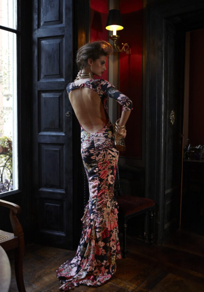 Le stampe floreali romantiche decorano i tessuti con delicatezza, aggiungendo un tocco femminile e sofisticato alla collezione. Il risultato è un equilibrio tra sensualità, eleganza e spirito mediterraneo, perfettamente in linea con lo stile della stilista.