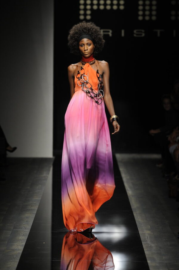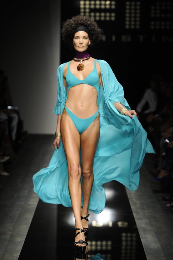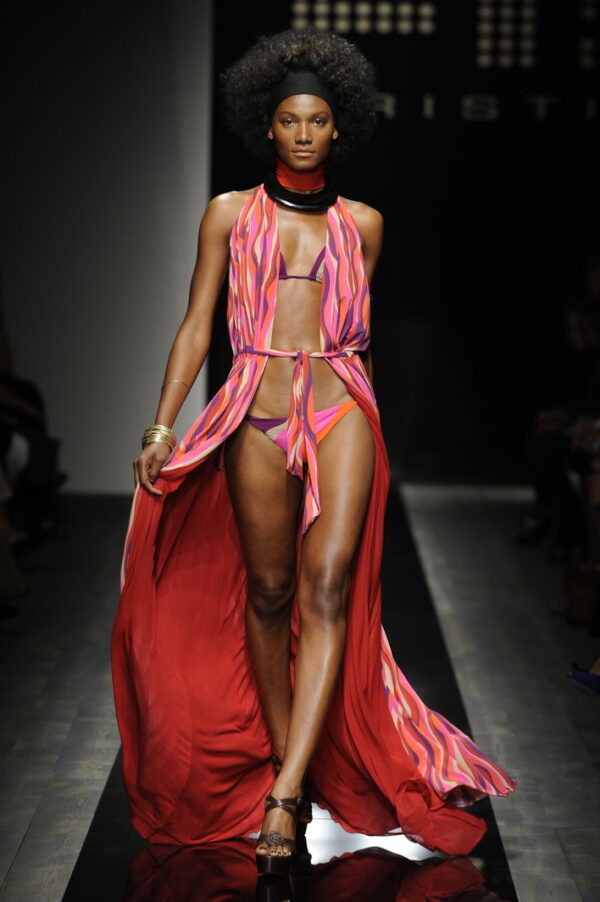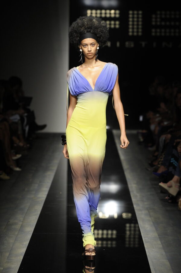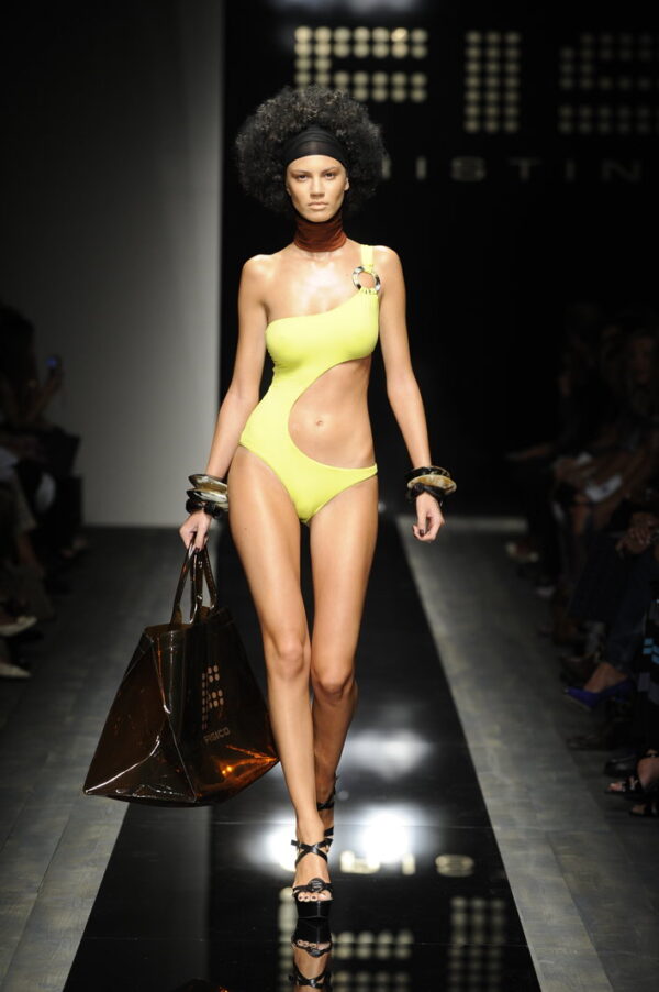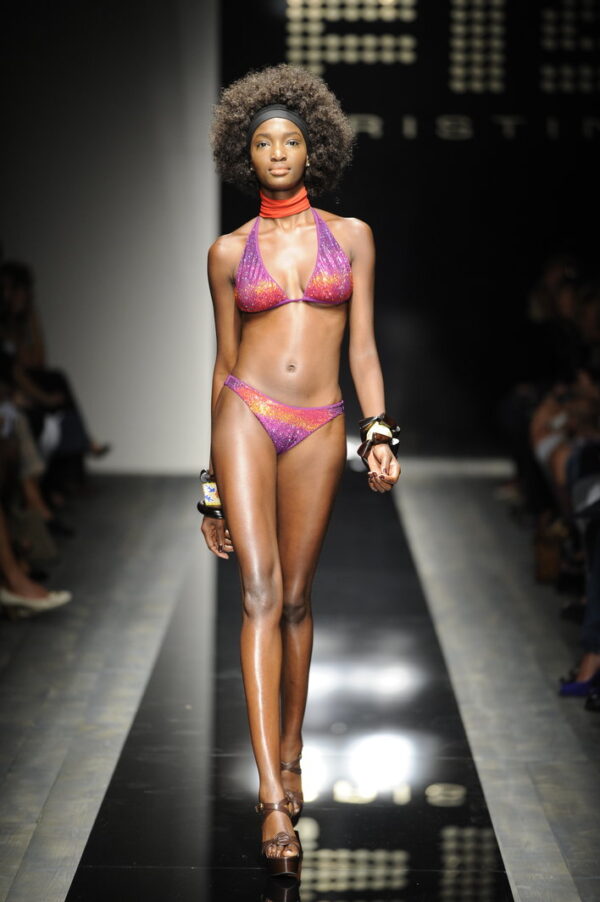 La sfilata Fisico di Cristina Ferrari del 2010 è un’esplosione di glamour etnico e colore, ispirata alle culture afro e alle loro geometrie audaci. La collezione si distingue per sfumature a contrasto e dettagli vivaci che trasformano ogni capo in un vero oggetto di desiderio.