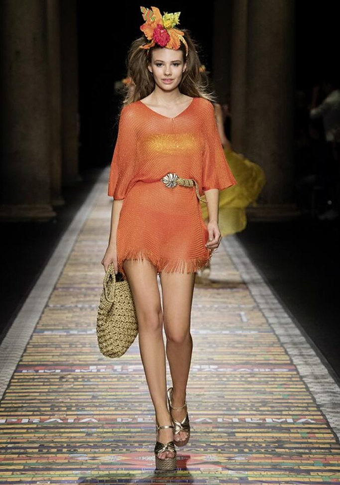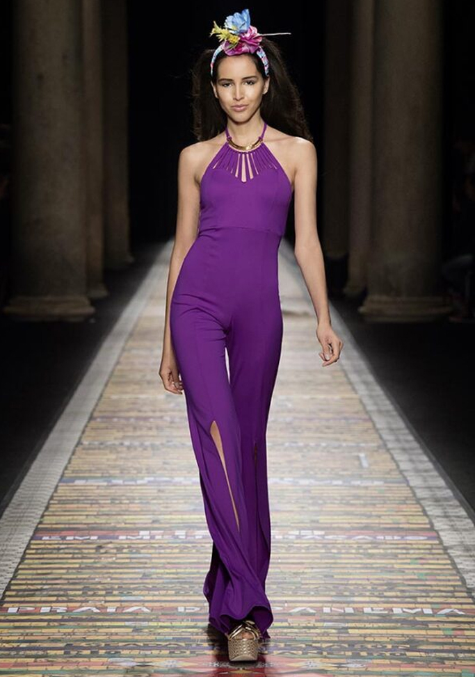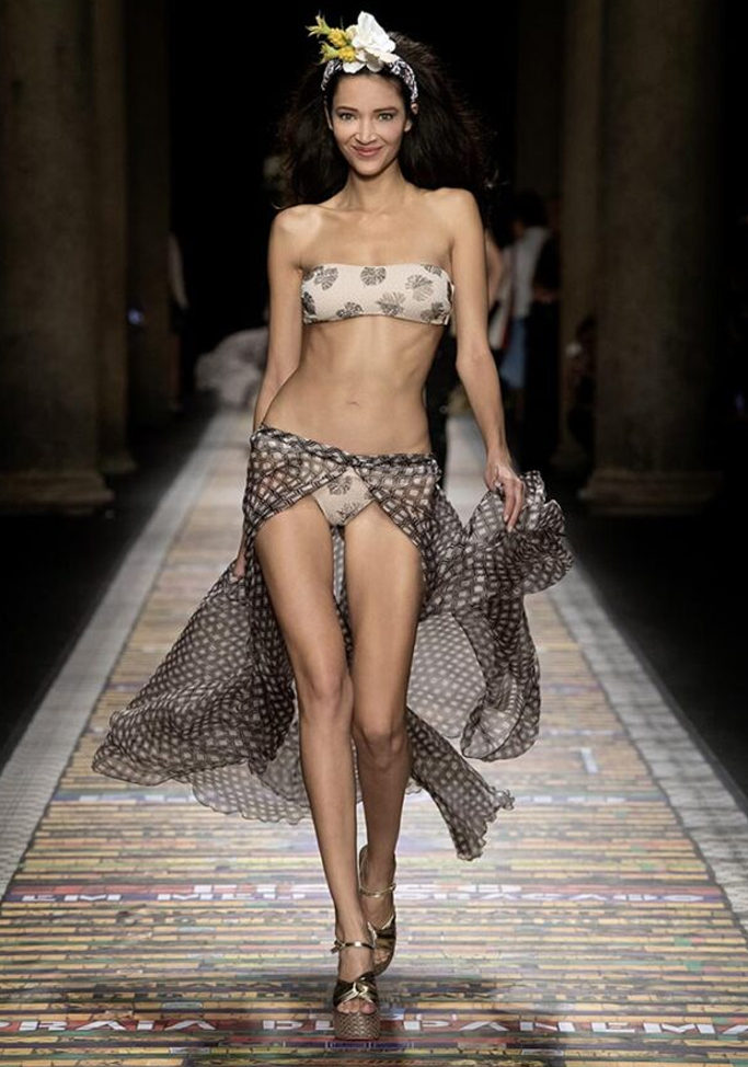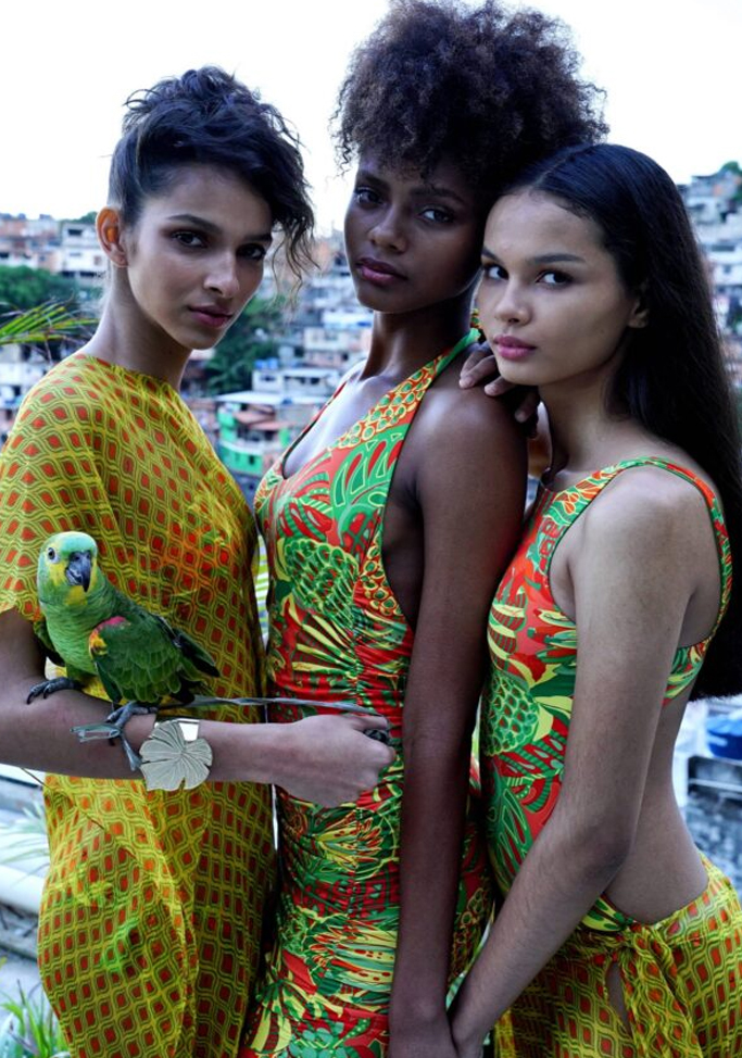 In passerella sfilano bikini, costumi interi, caftani e abiti leggeri, realizzati con tessuti fluidi e preziosi che esaltano il corpo femminile. Le stampe e i motivi richiamano i colori vibranti della natura brasiliana, dei mercati e delle spiagge, mentre dettagli come frange e applicazioni decorative aggiungono movimento e ritmo, catturando lo spirito allegro e festoso del Brasile.