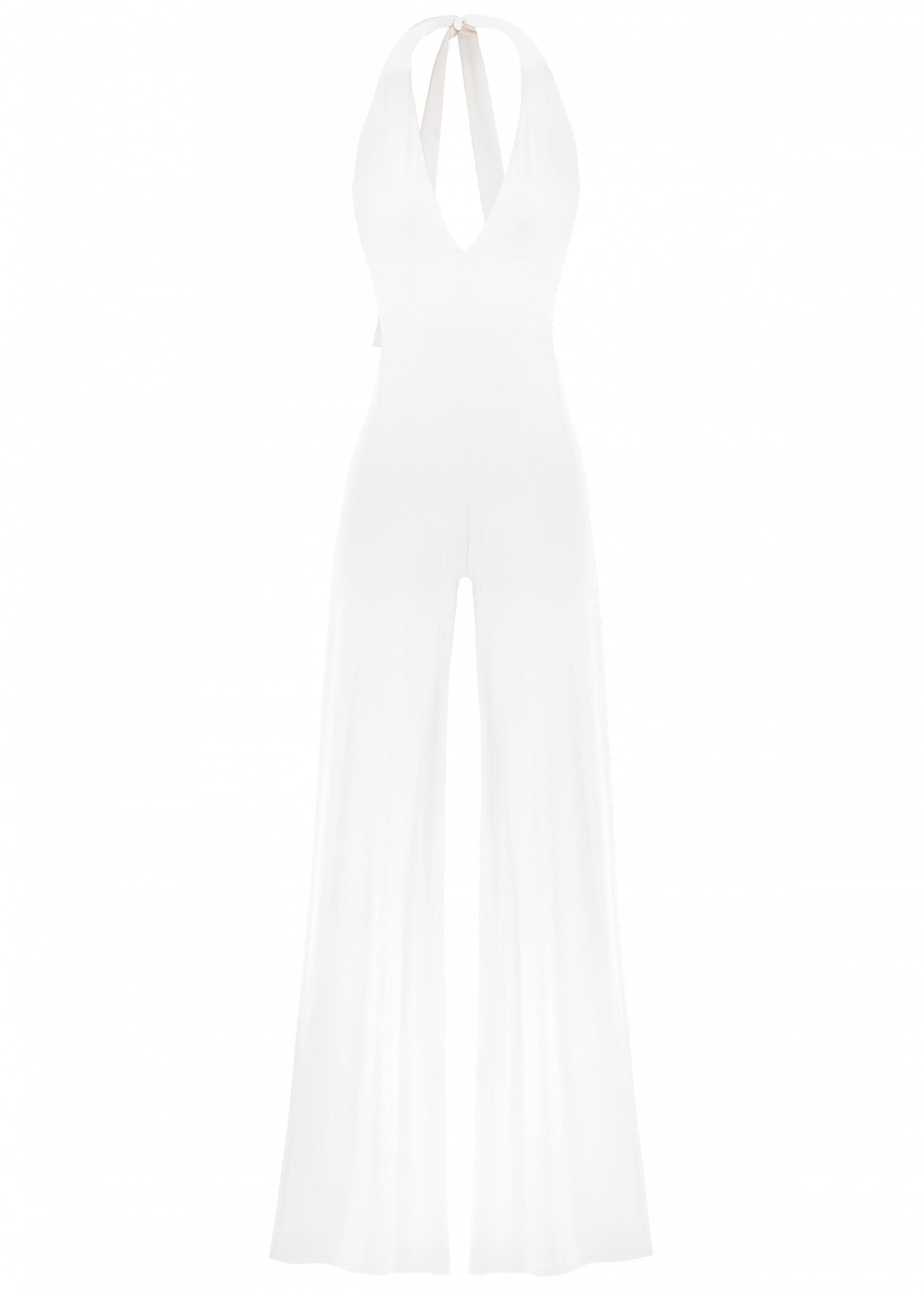 Tuta elegante a gamba palazzo dal fascino sofisticato e luminoso. Il design con scollo halter neck si lega delicatamente dietro il collo, lasciando le spalle scoperte e valorizzando la linea del décolleté e della schiena. Il tessuto fluido accompagna il movimento con leggerezza, mentre la linea palazzo slancia la figura creando un effetto raffinato e moderno.
